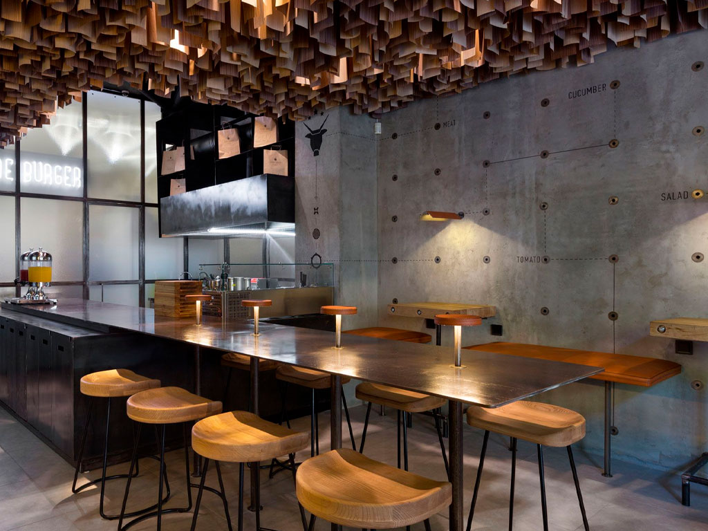 Наиболее предпочтительным материалом для создания уникального дизайна в кафе с бургерами является металл. Хромированные элементы в интерьере подчеркивают серьезность заведения общественного питания. Кроме этого, металл отлично сочетается с деревом, современными отделочными материалами. Интересный симбиоз получается и при сочетании металлических поверхностей с грубой отделкой стен или открытой кирпичной кладкой. В этом случае получается некая имитация стиля лофт.