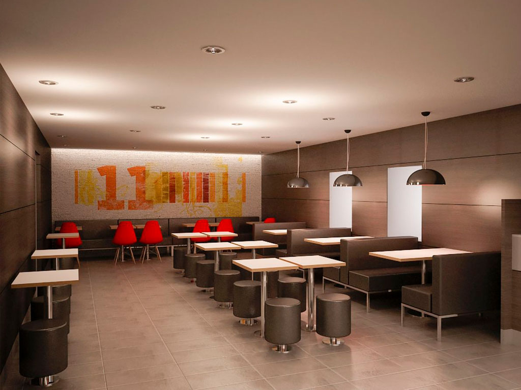 Система освещения для заведения должна подбираться в соответствии с выбранным цветовым сочетанием. Светильники могут располагаться как на потолке или стенах, так и в местах оформления и выдачи заказов. Однако при размещении осветительных приборов важно учитывать, что света в помещении должно быть достаточно, чтобы осветить всю площадь, но исключить слишком яркого свечения.