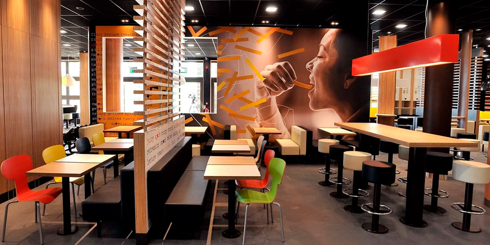 В интерьере такого рода заведений обязательно должны присутствовать различные рекламные плакаты, вывески и меню, которые будут информировать посетителей о подаваемых блюдах. Если же в бургерной предусмотрен большой ассортимент фаст-фуда, то предпочтительнее установить светящееся табло, на котором будут показываться и название блюда, и его цена.
