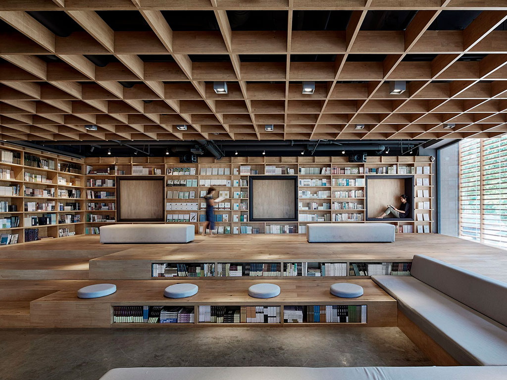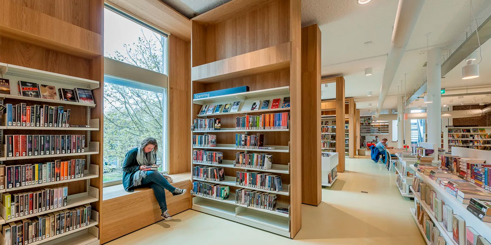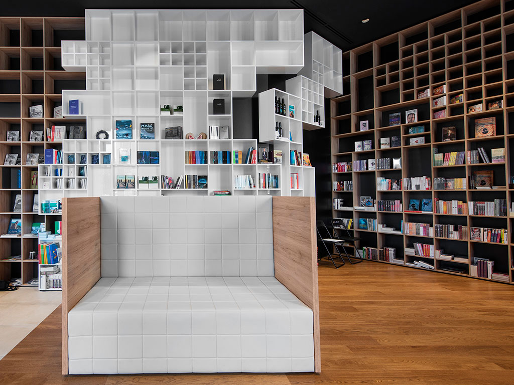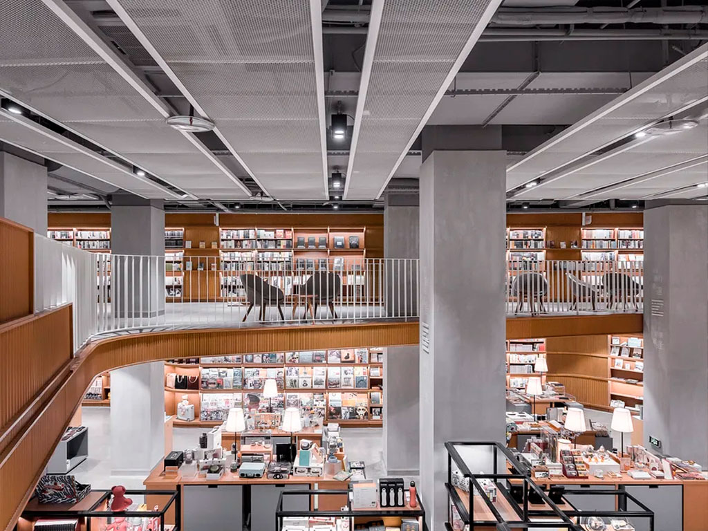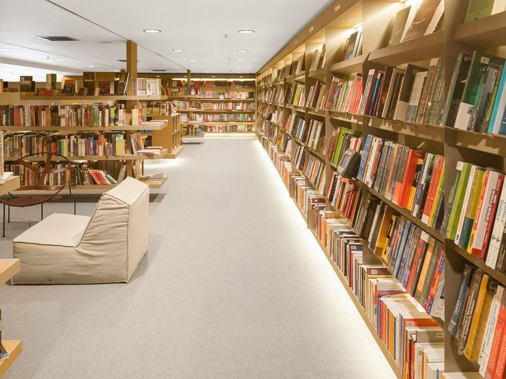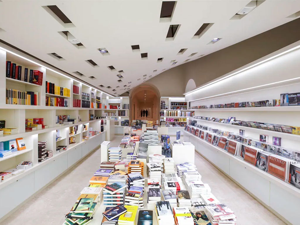 При такой планировке помещение хорошо просматривается и не затемняется. Правильное естественное освещение и подбор люстр и светильников в дизайне интерьера книжного магазина гарантируют стабильно высокий покупательский спрос. Клиент не будет испытывать нагрузки на глаза и сможет уделить пролистыванию и предварительному изучению книги столько времени, сколько захочет.