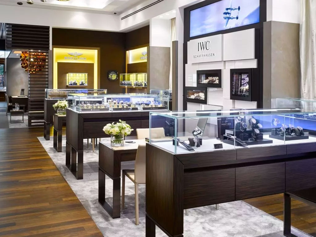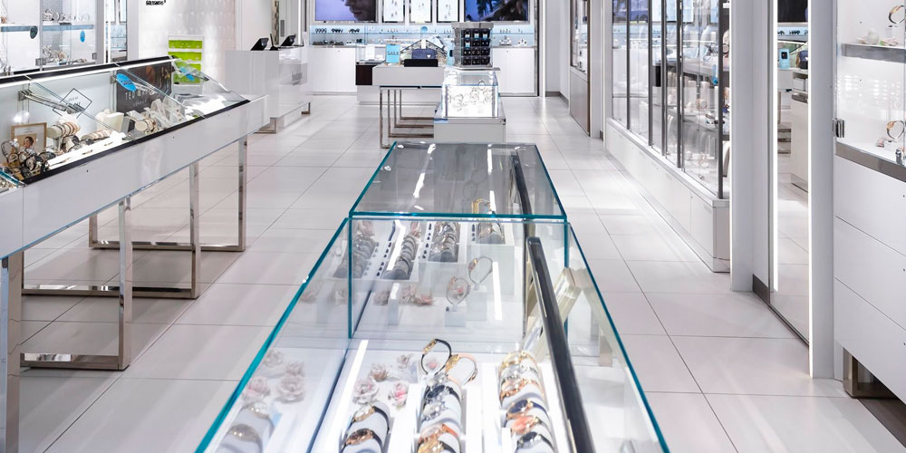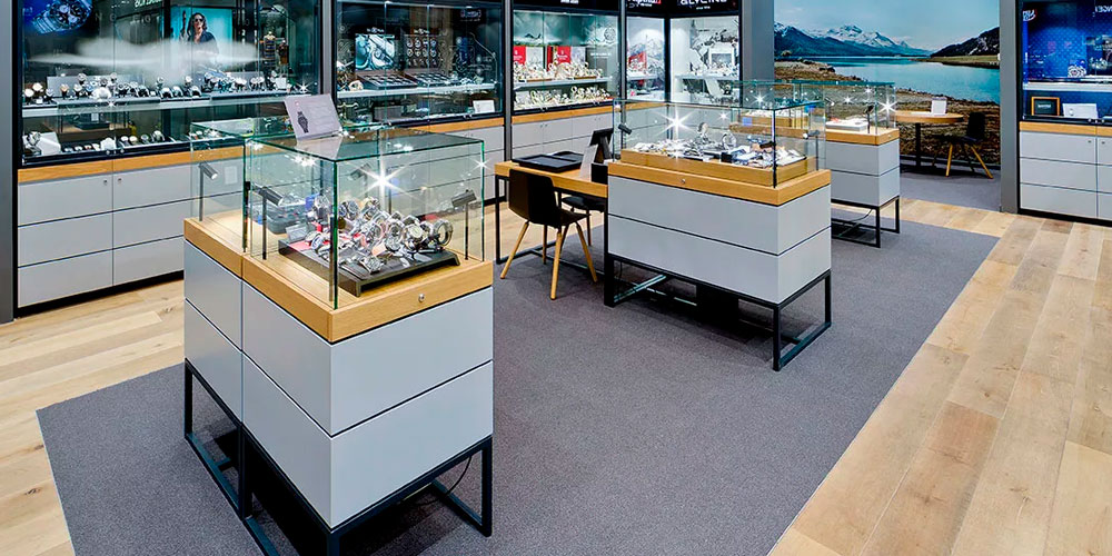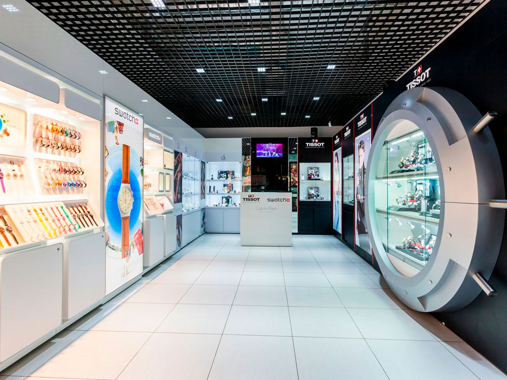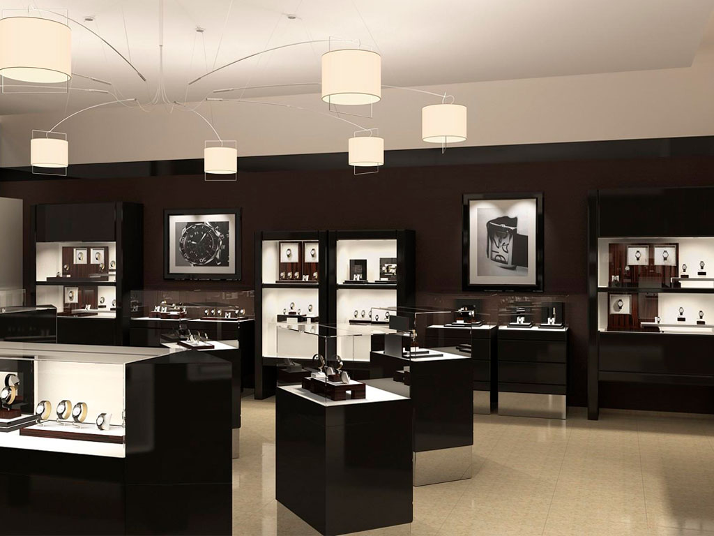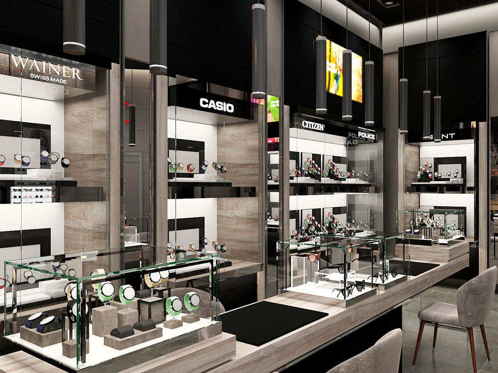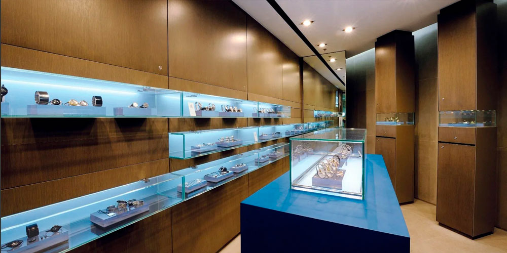 Что касается отделочных материалов и цвета торгового зала, то здесь лучше отдать предпочтение нейтральным оттенкам, которые подчеркнут блеск металлических ремешков и корпуса аксессуара, а также сияние камней и прочих элементов отделки.