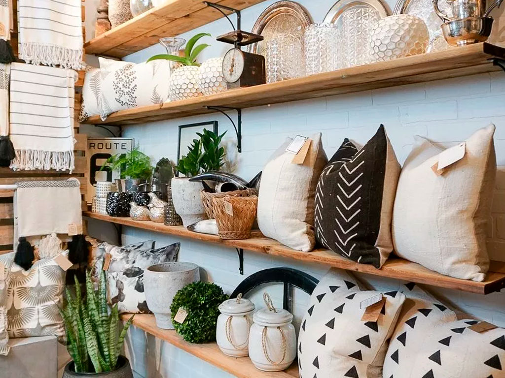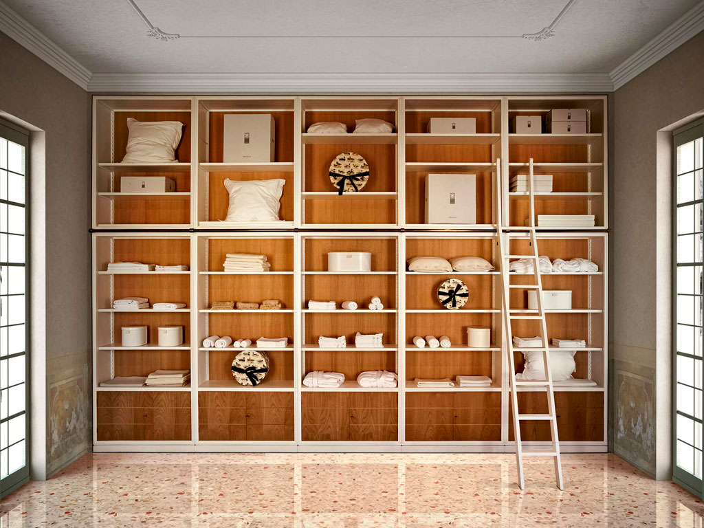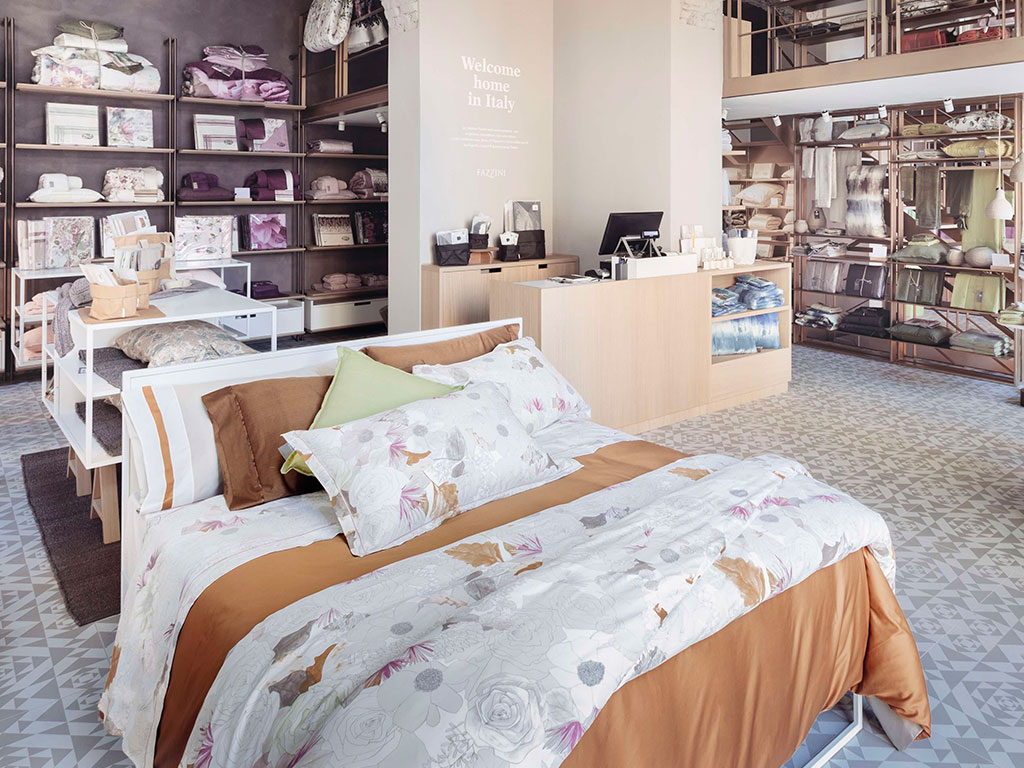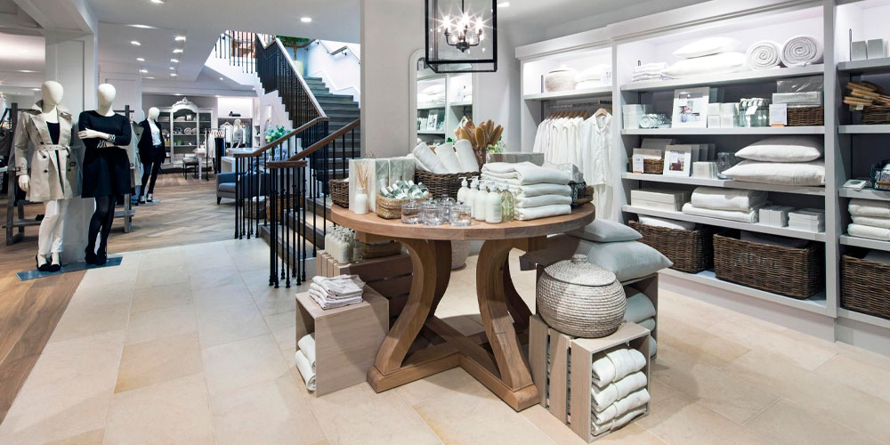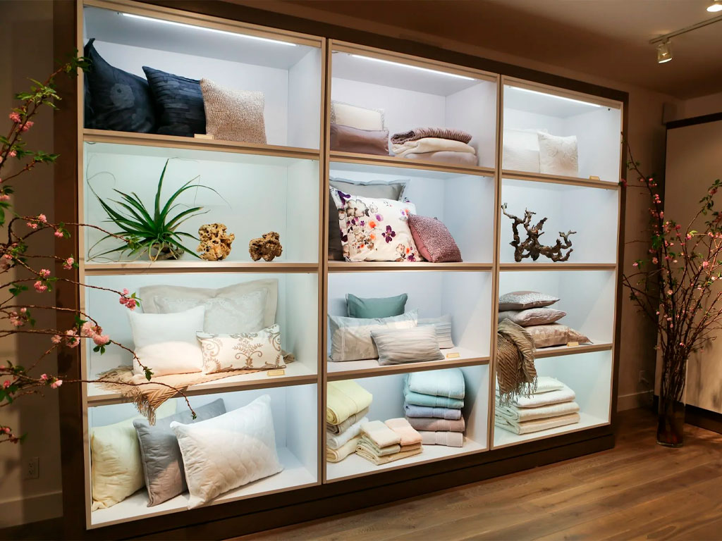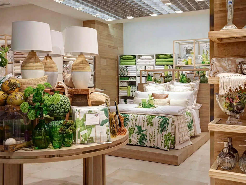 Важная часть магазина – витрины. Если они большие, то в них можно устроить имитацию определенной комнаты. Например, в дизайн магазина постельного белья обязательно включат зону, где будет стоять кровать с разложенными на ней покрывалами и пледами. Рядом поставят передвижную вешалку с халатами. Так посетителю будет легче представить, как эти предметы впишутся в его интерьер после покупки.