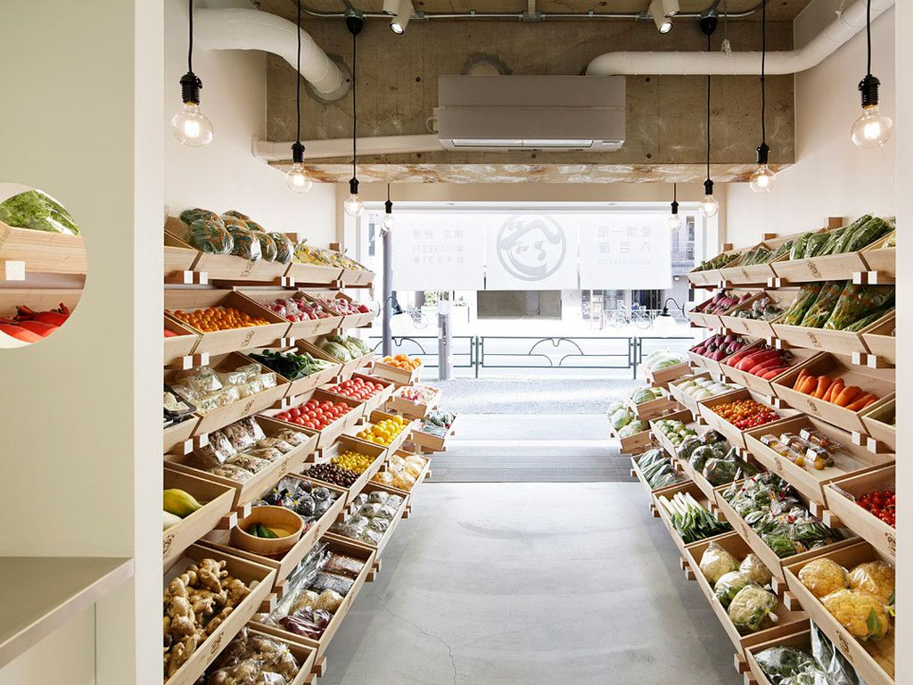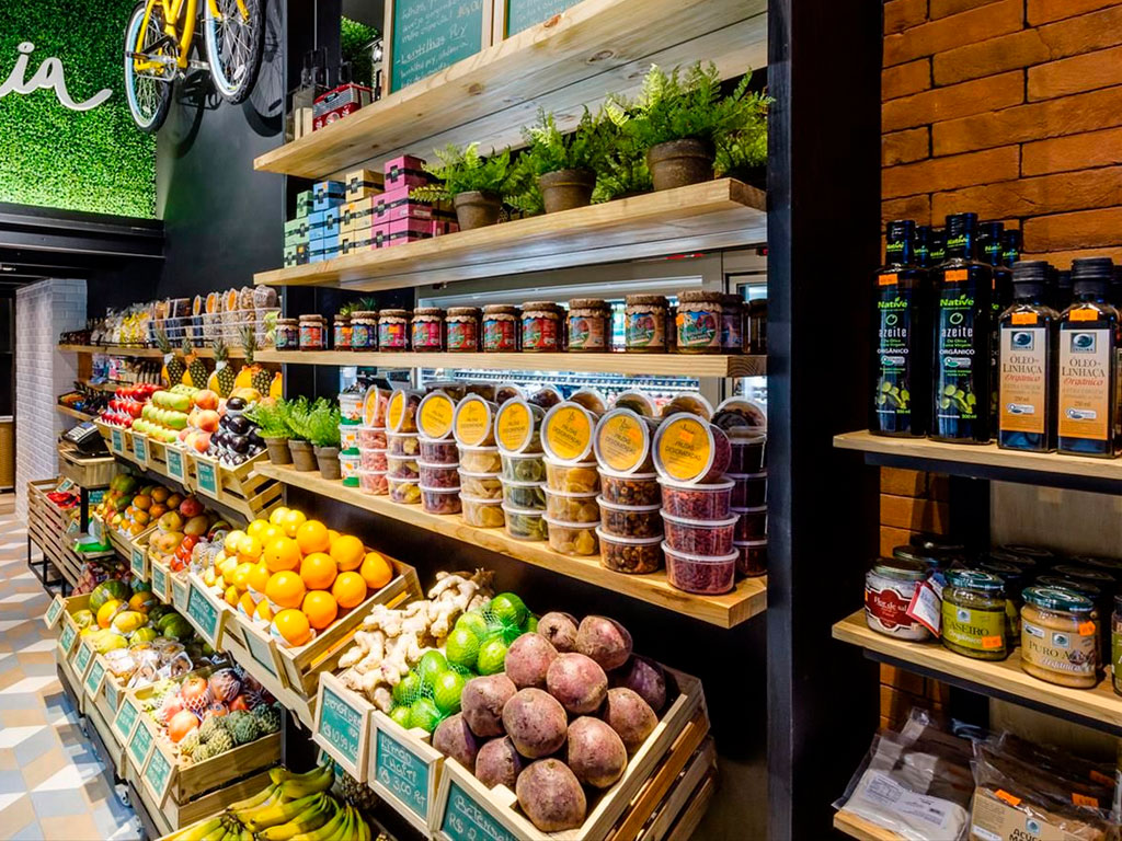 Общее освещение можно сделать приглушённым, а каждую полку по периметру точечно подсветить. Это позволит визуально выделить каждый вид продукции.