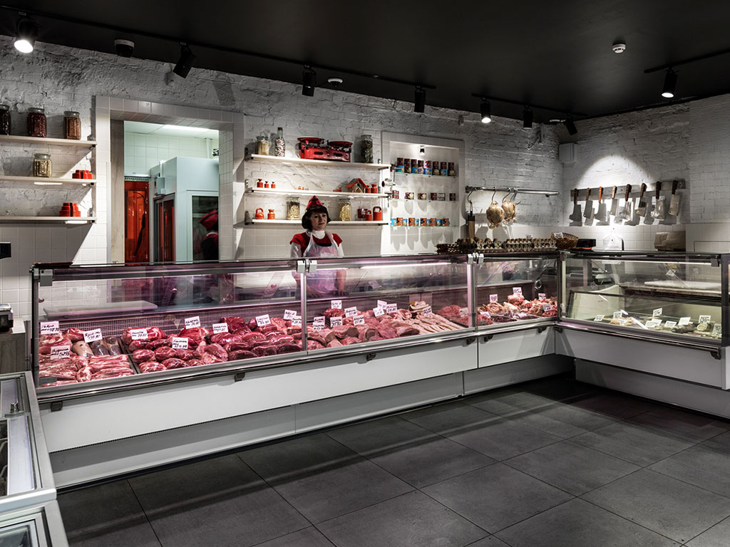 Магазин мясной продукции обычно располагается неподалёку от жилых домов. Данная категория торговых помещений не требует сверх необычного дизайна или использования особых элементов декора. Оформление должно создавать атмосферу уютной домашней лавочки, где можно купить то, что мы едим практически каждый день.