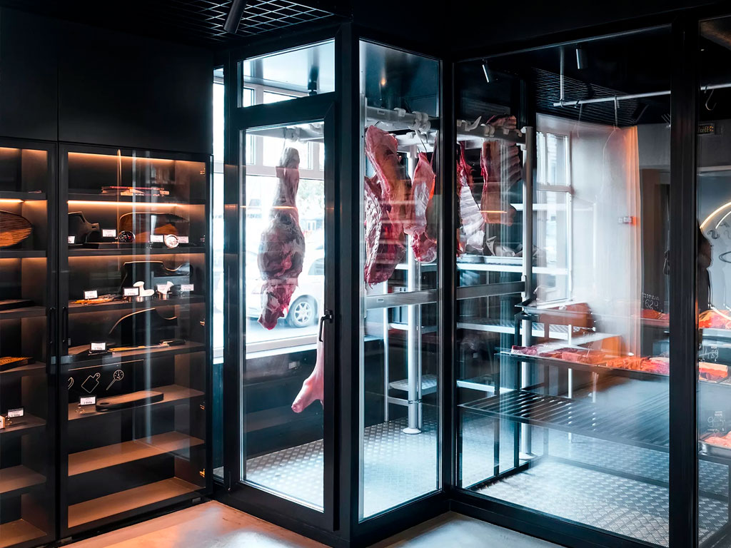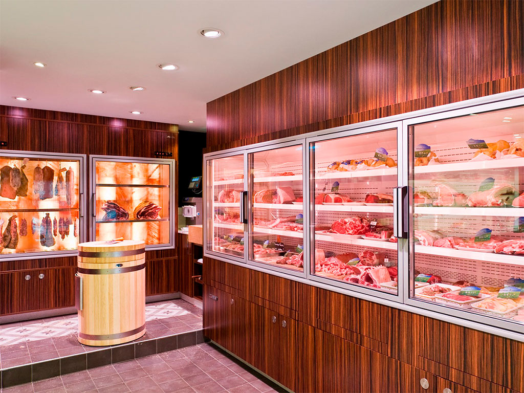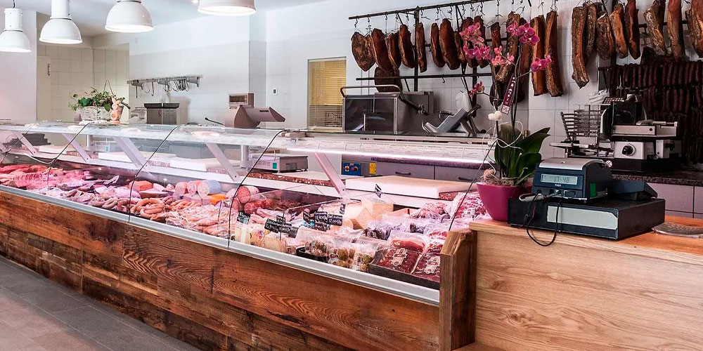 Во-первых, следует подумать о размещении витрин и полок с продукцией. На них должны лежать мясные изделия, разделенные по виду: свинина отдельно, говядина отдельно, птица, колбасы и сосиски, уши, язык и прочие подобные продукты отдельно. Стеллажи с копчёностями следует расположить так, чтобы аромат этой продукции встречал посетителя, поскольку запахи являются сильным стимулятором к совершению покупок.