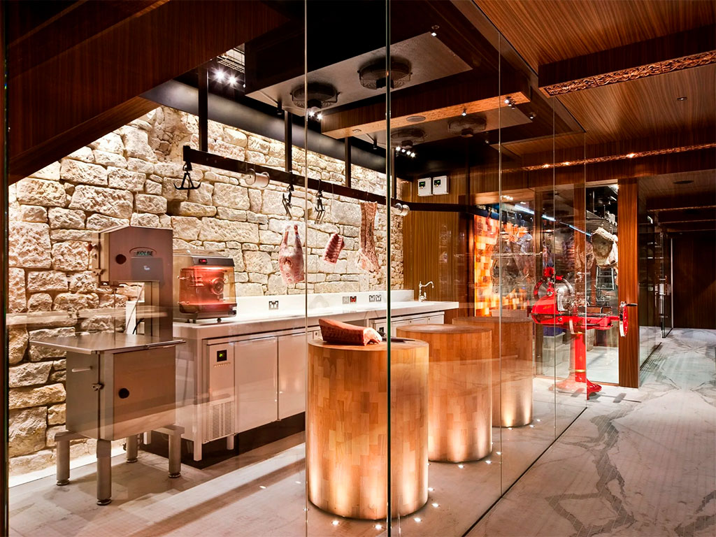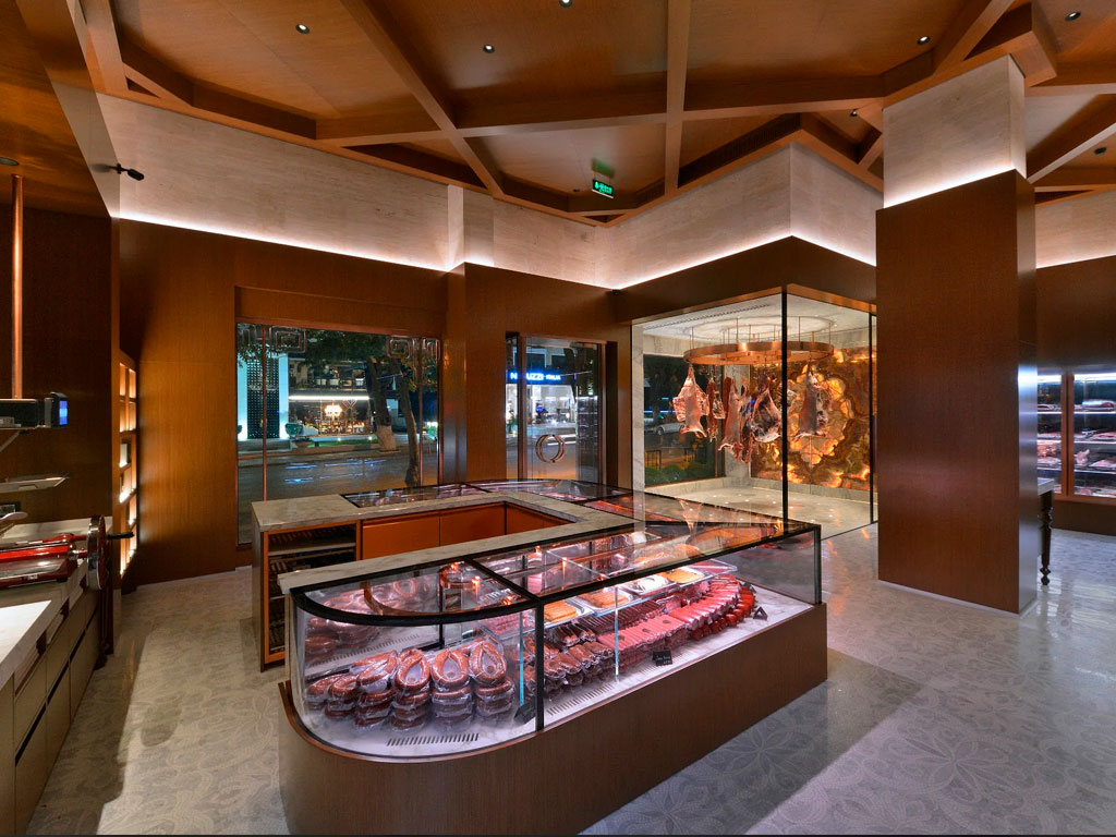 Японский стиль подразумевает минимализм, строгость и чёткое расположение всего убранства в пространстве. Поэтому такой дизайн интерьера позволит сделать продаваемую мясную продукцию главным украшением и основным действующим элементом в помещении.