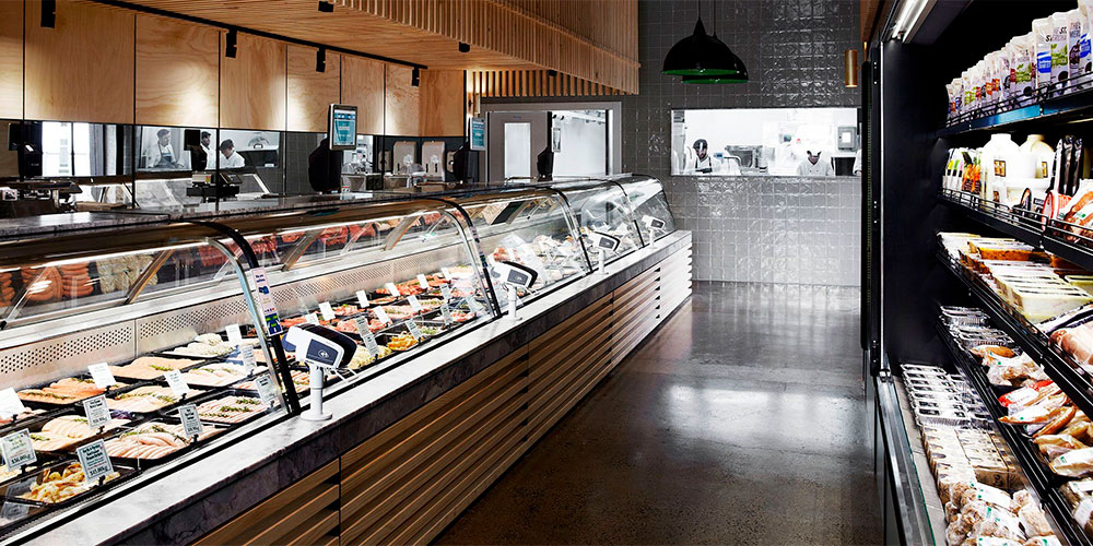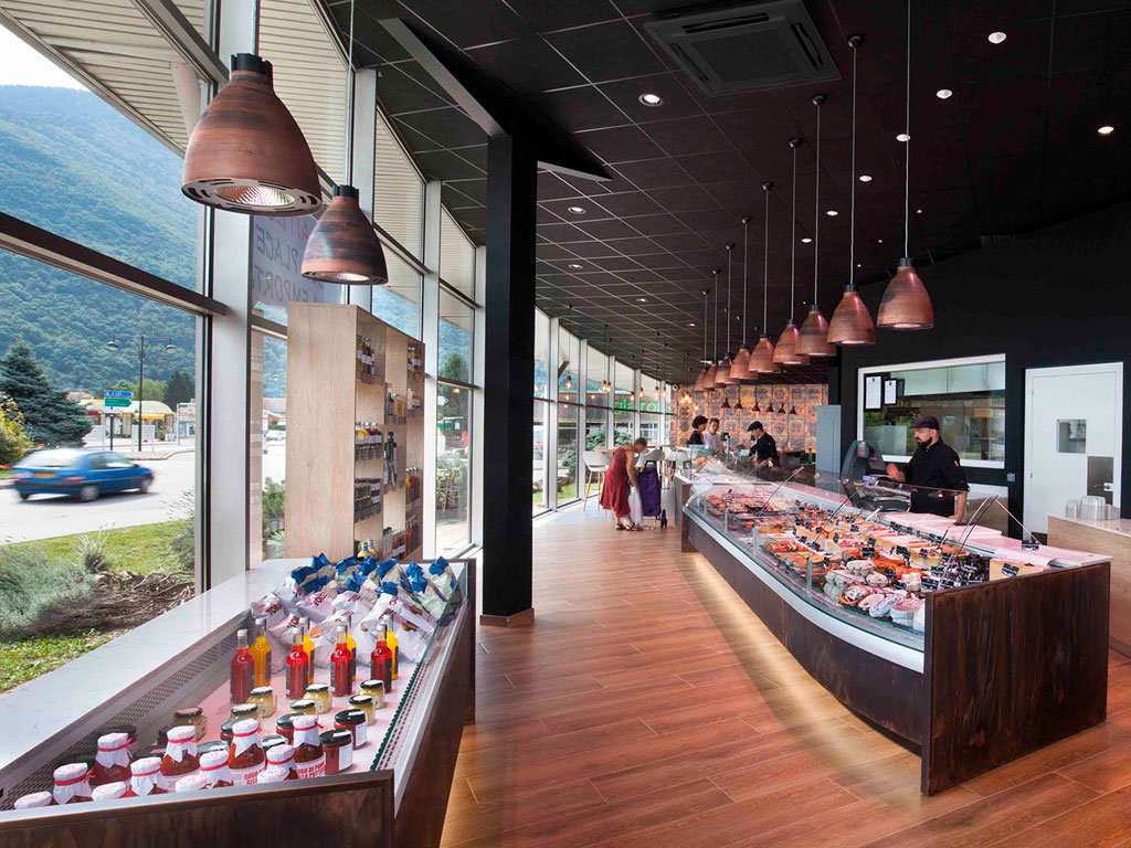 Неоклассицизм отличается использованием контрастных оттенков и минималистичной, строгой геометрии. Прямоугольные колонны, прилавки под прямой угол и акцентированная в центре зона – всё это отлично сочетается с продажей мясной продукции.