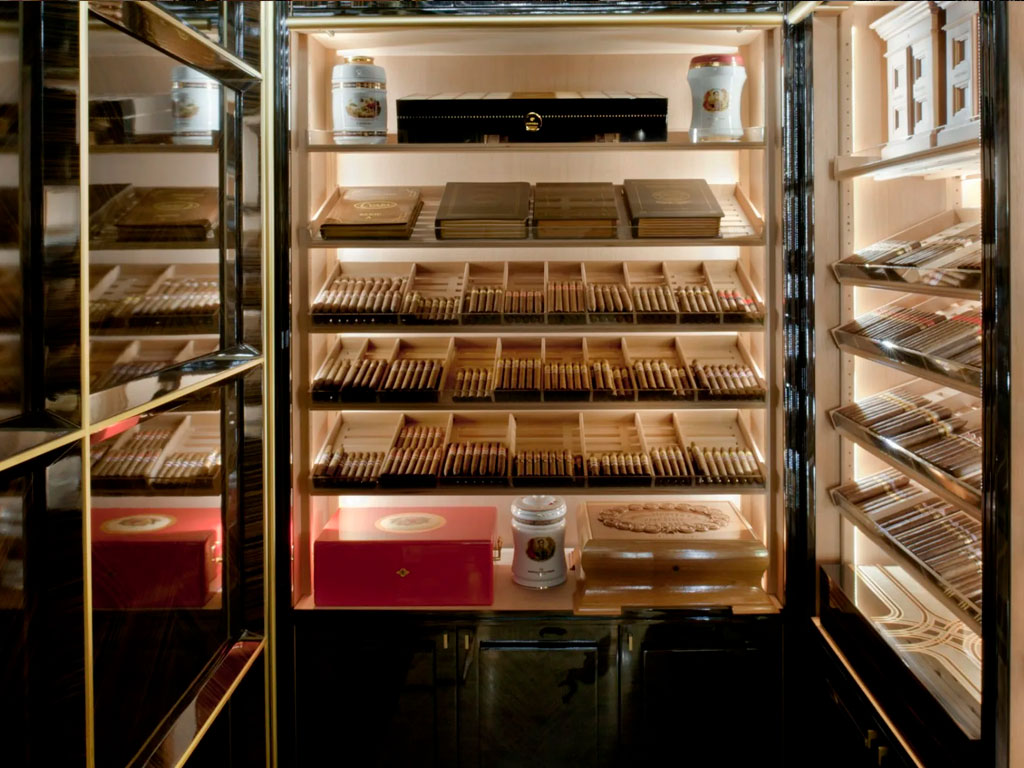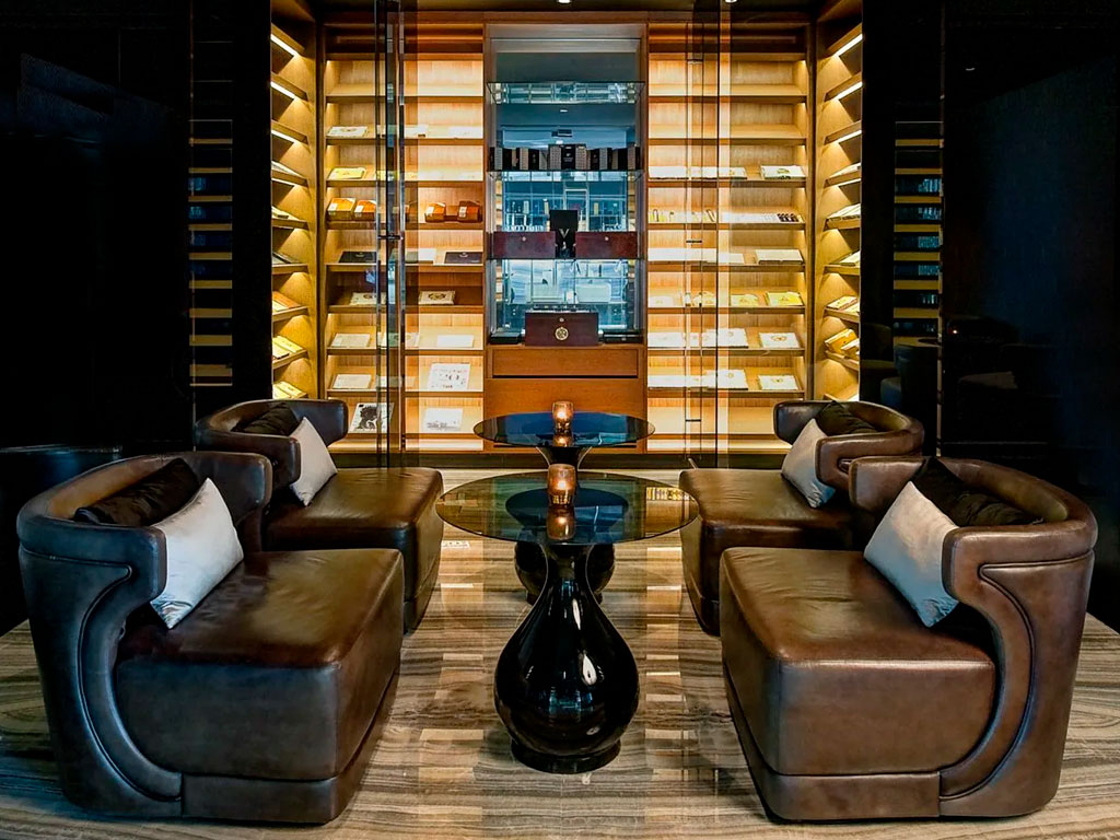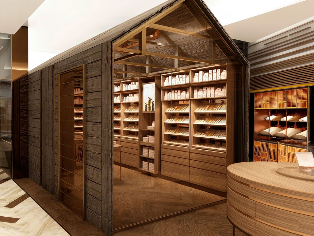 Английский стиль в дизайне обычно ассоциируется с тёмно-коричневой палитрой, тяжёлой мебелью, гранитным, мраморным или каменным полом, а также отсутствием или минимальным количеством декора. Приглушенный свет, витрины и стеллажи с деревянными коробками с сигарами и другими табачными изделиями, а также кожаные диваны и высокие стулья цвета «морёного» дуба – всё это атрибуты английского табачного салона.